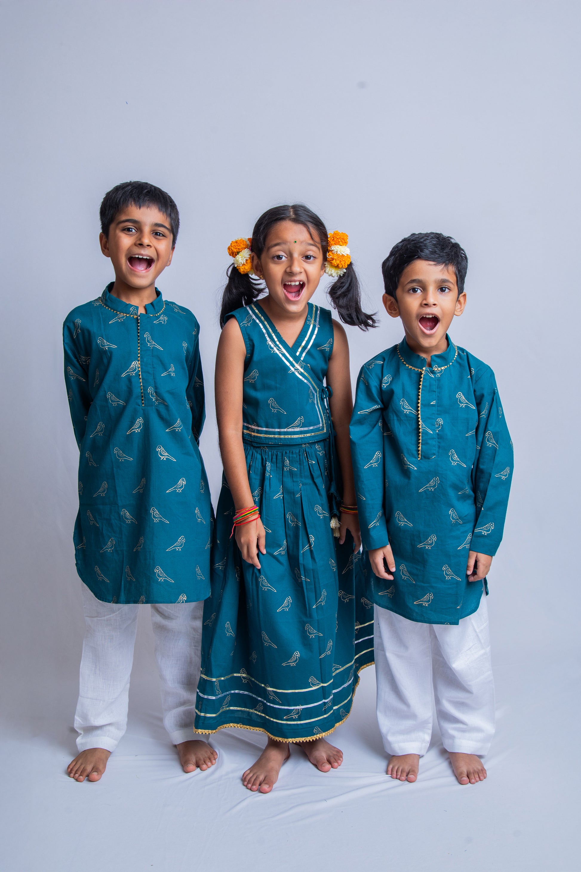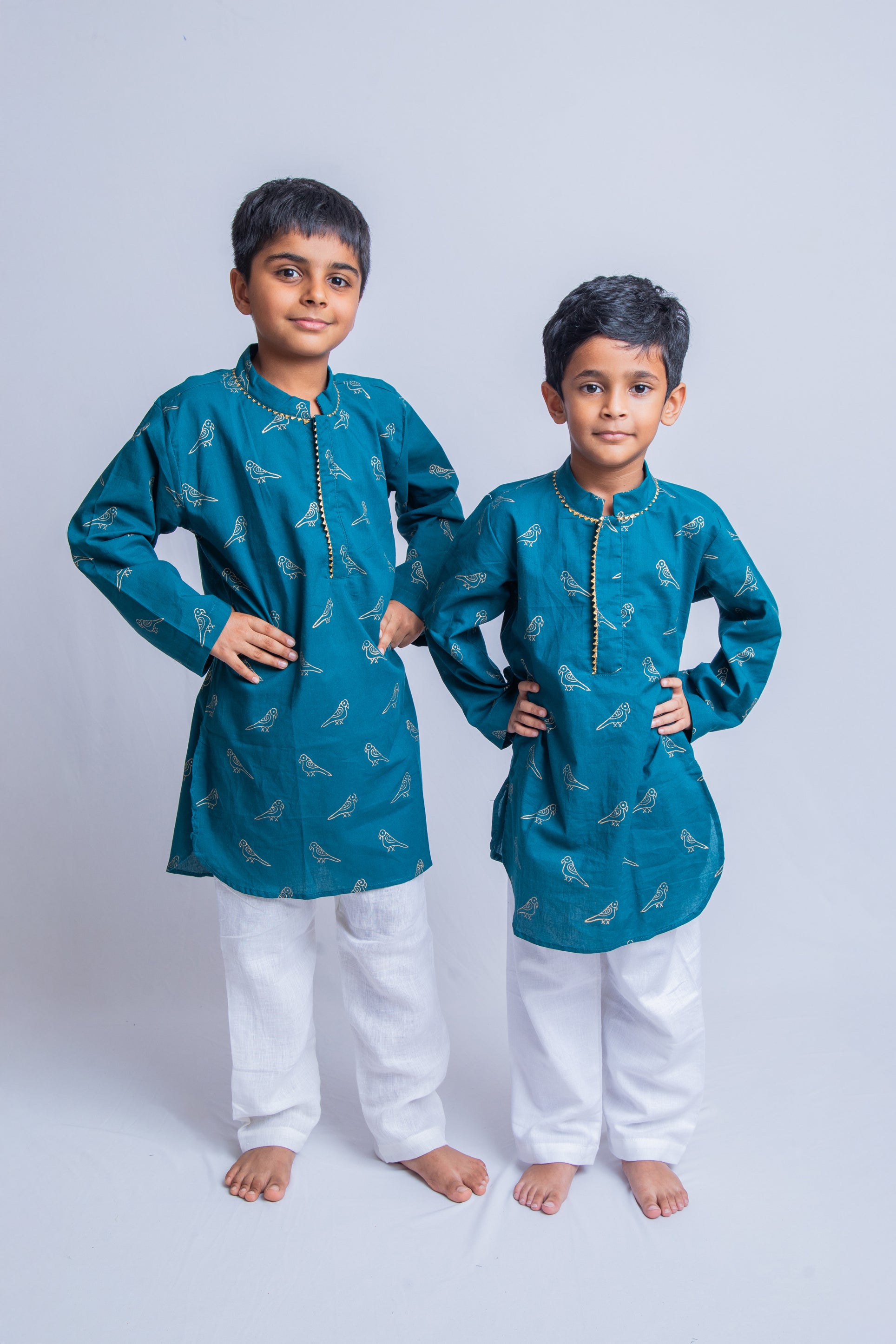Dress your little one in this beautiful Teal Green Parrot print themed festive set, made from 100% cotton for all-day comfort. Featuring a gold khadi parrot print, the kurta comes with a stylish button placket with triangle shaped gota patti detailing around it, with off-white cotton pants to offer a unique look. Perfect for a festive occasion which blends traditional elegance with playful details.