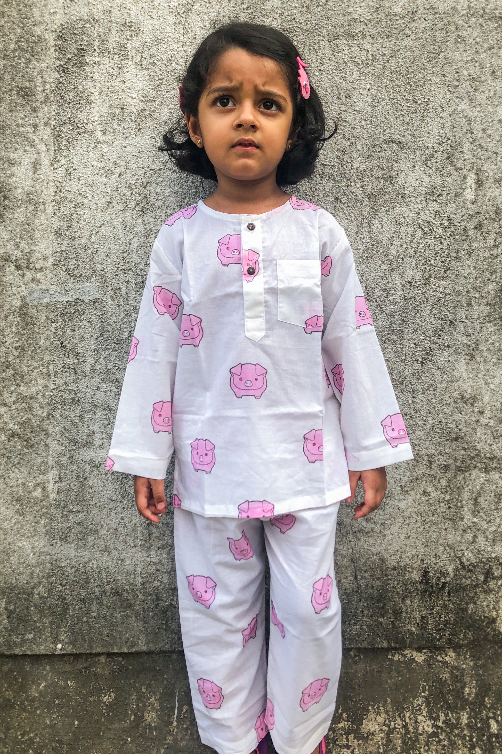 Sleep tight in our soft cotton mul night suit with our Red Santa Hats Kurta and Pajama set which is hand-block printed.
