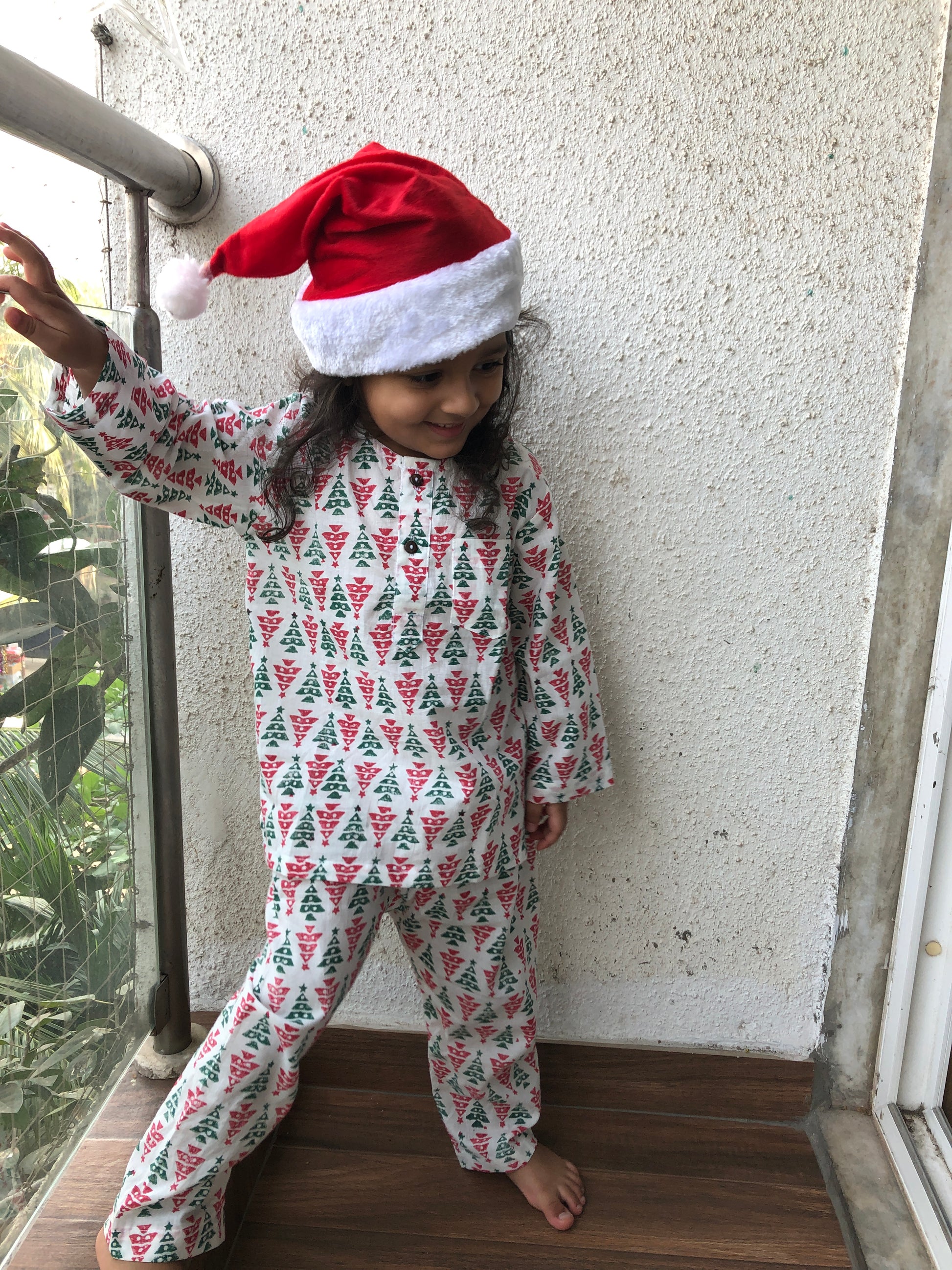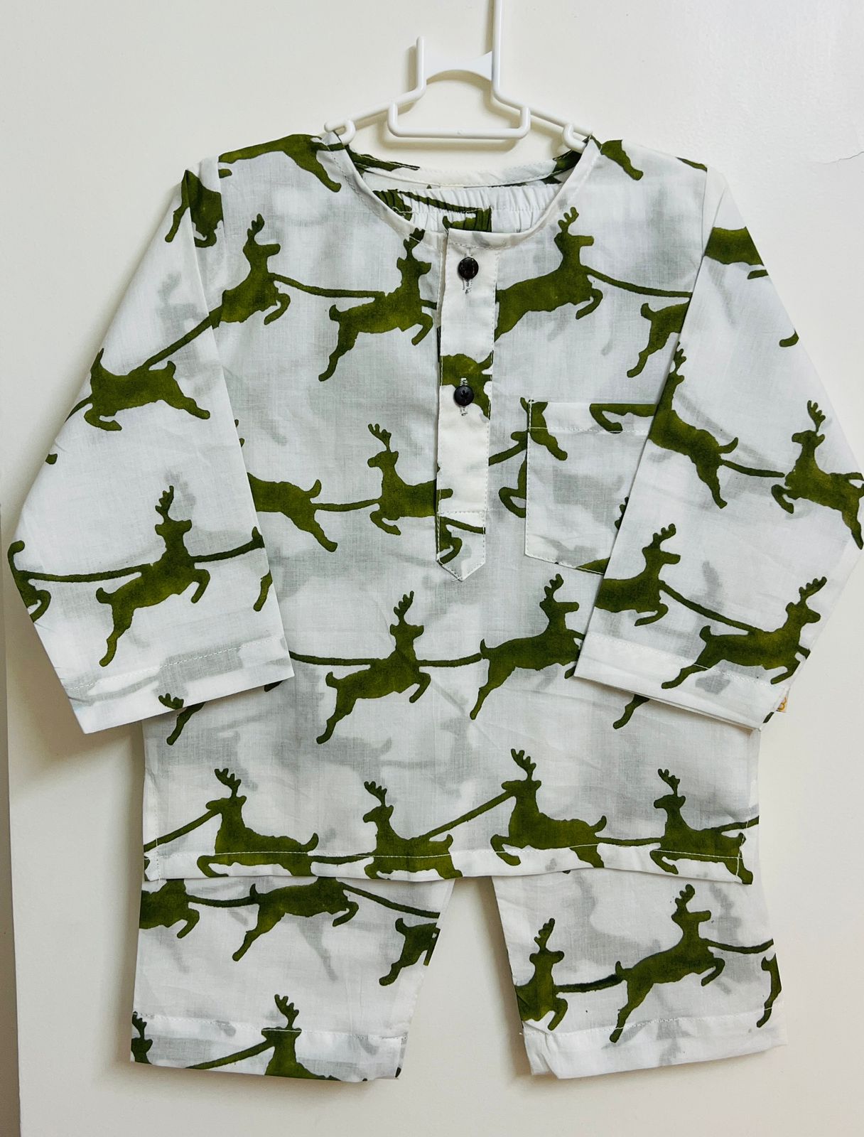 Sleep tight in our soft cotton mul night suit with these adorable Olive Green Reindeers, Kurta and Pajama set which is hand-block printed.