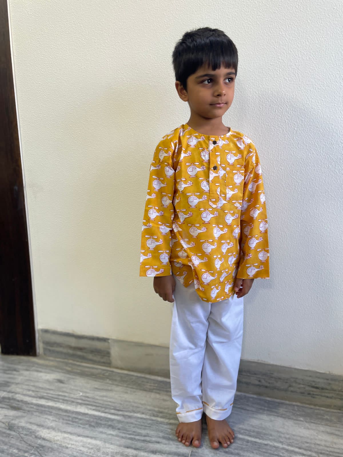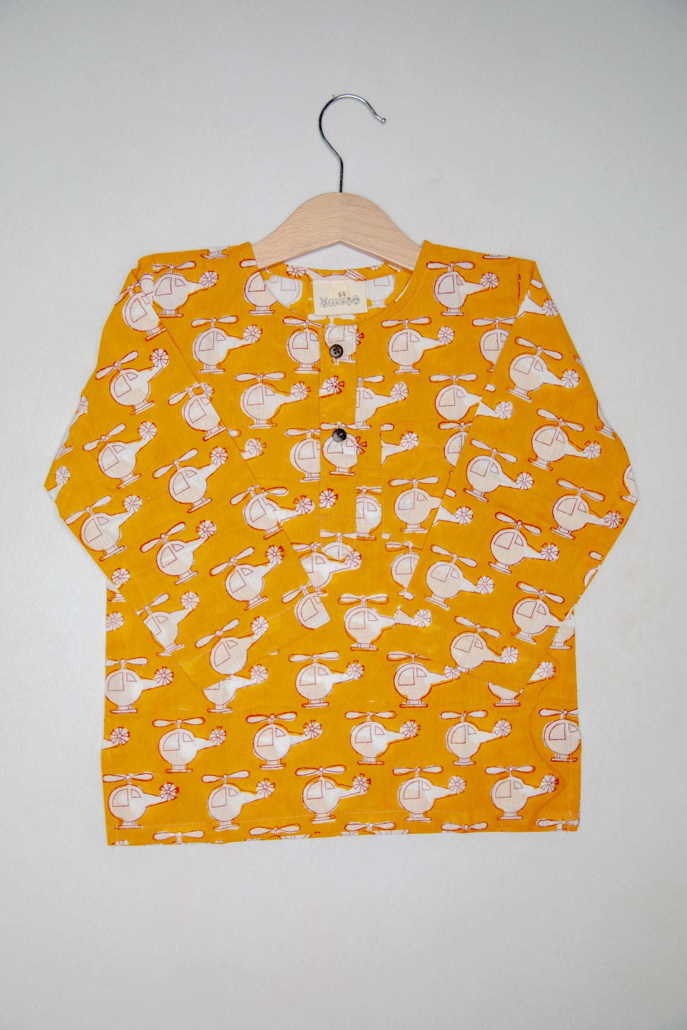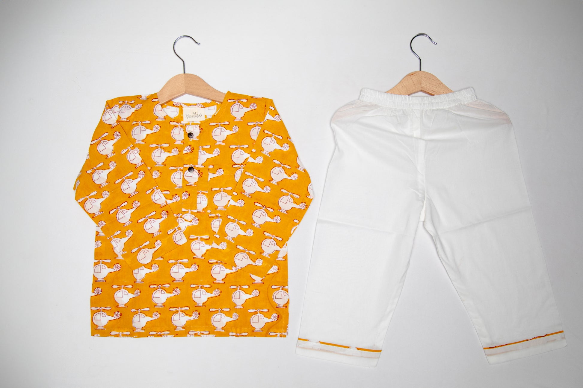 Sleep tight in our soft cotton mul night suit with yellow helicopter kurta and white pajama with piping which is hand-block printed.