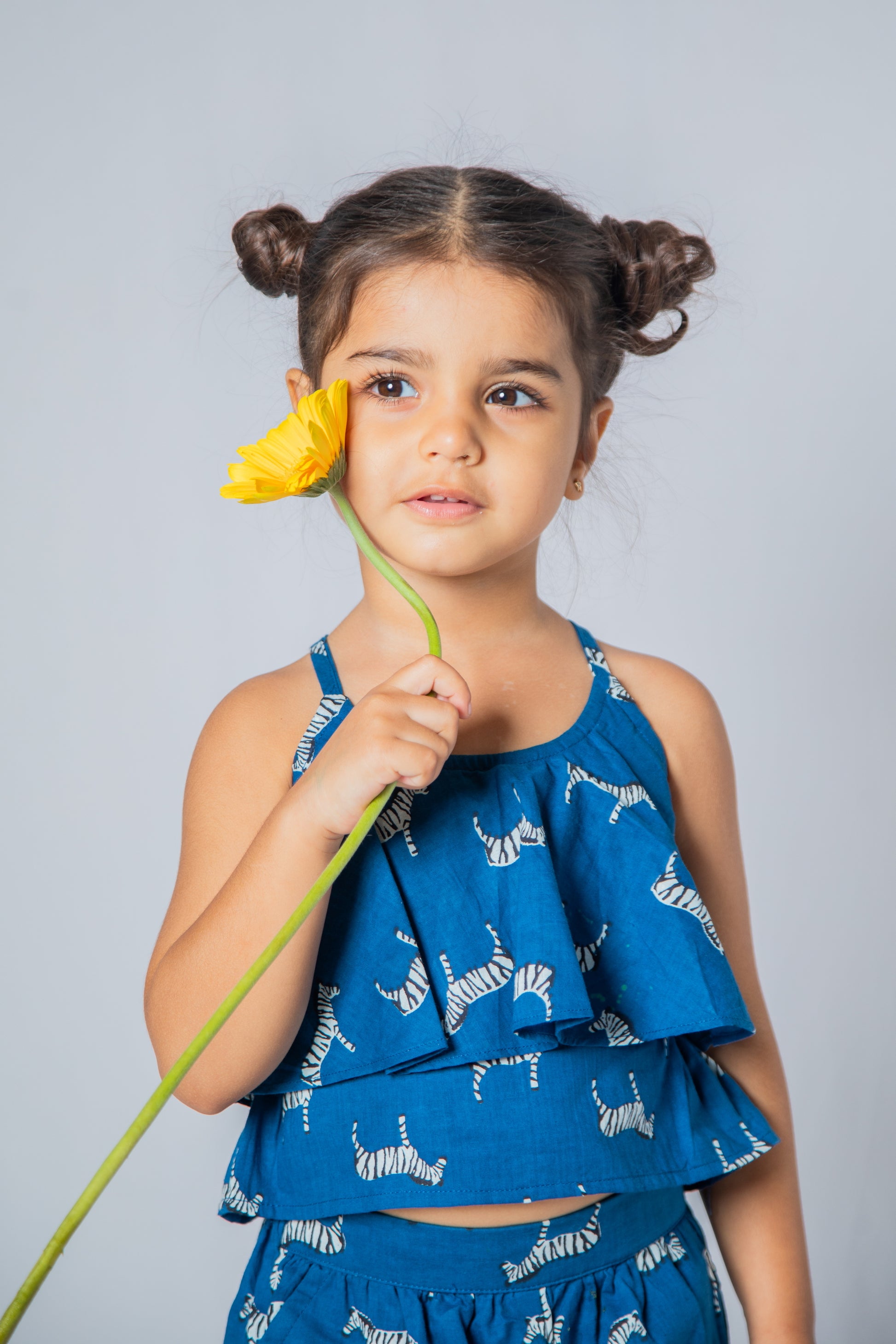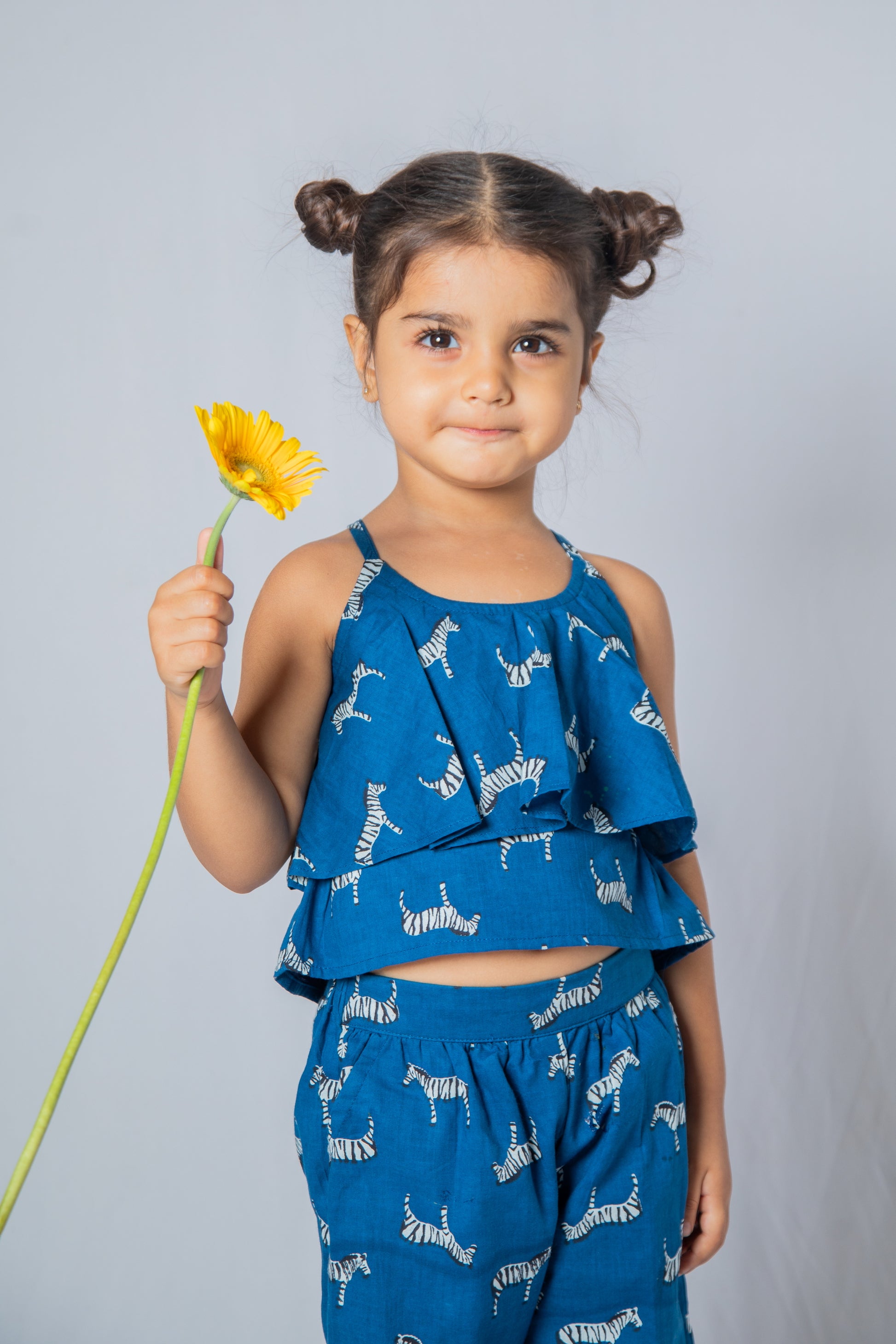 Introducing our most favourite co-ord set: Crafted from 100% cotton, this set features our favourite Zebras. Perfectly co-ordinated crop styled flutter top with an elasticated pocket style flare pants, a must have ensemble for every child.