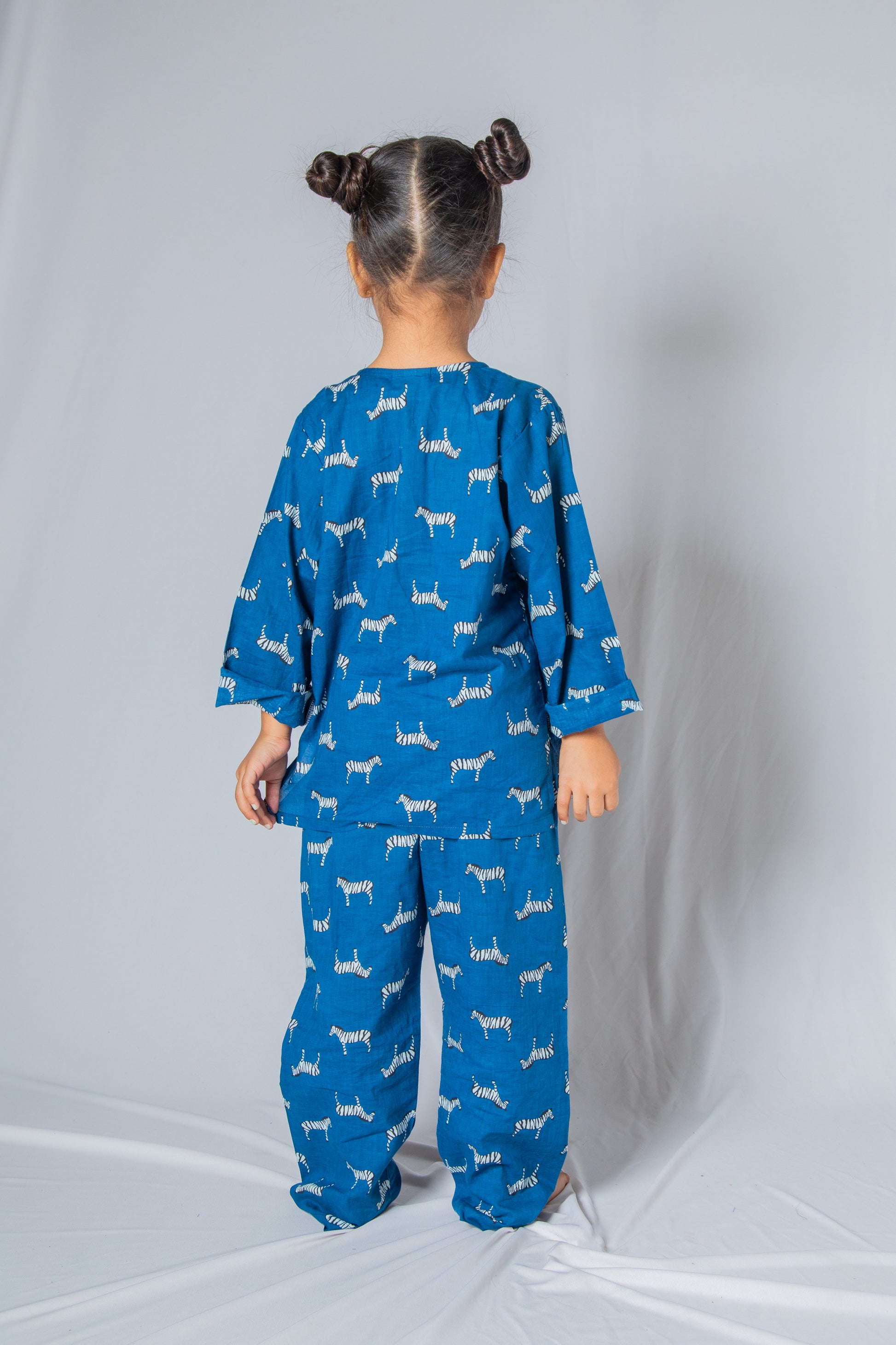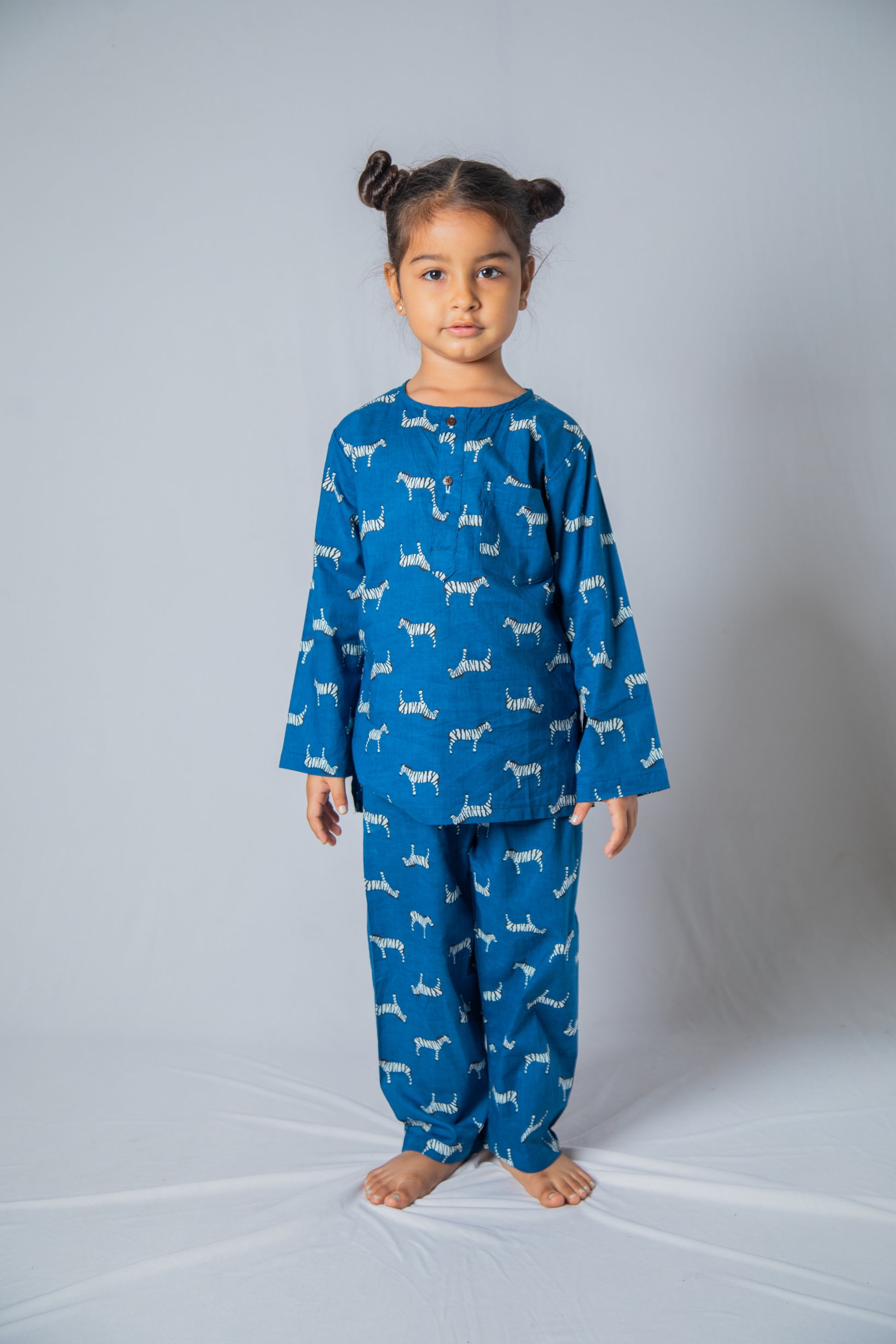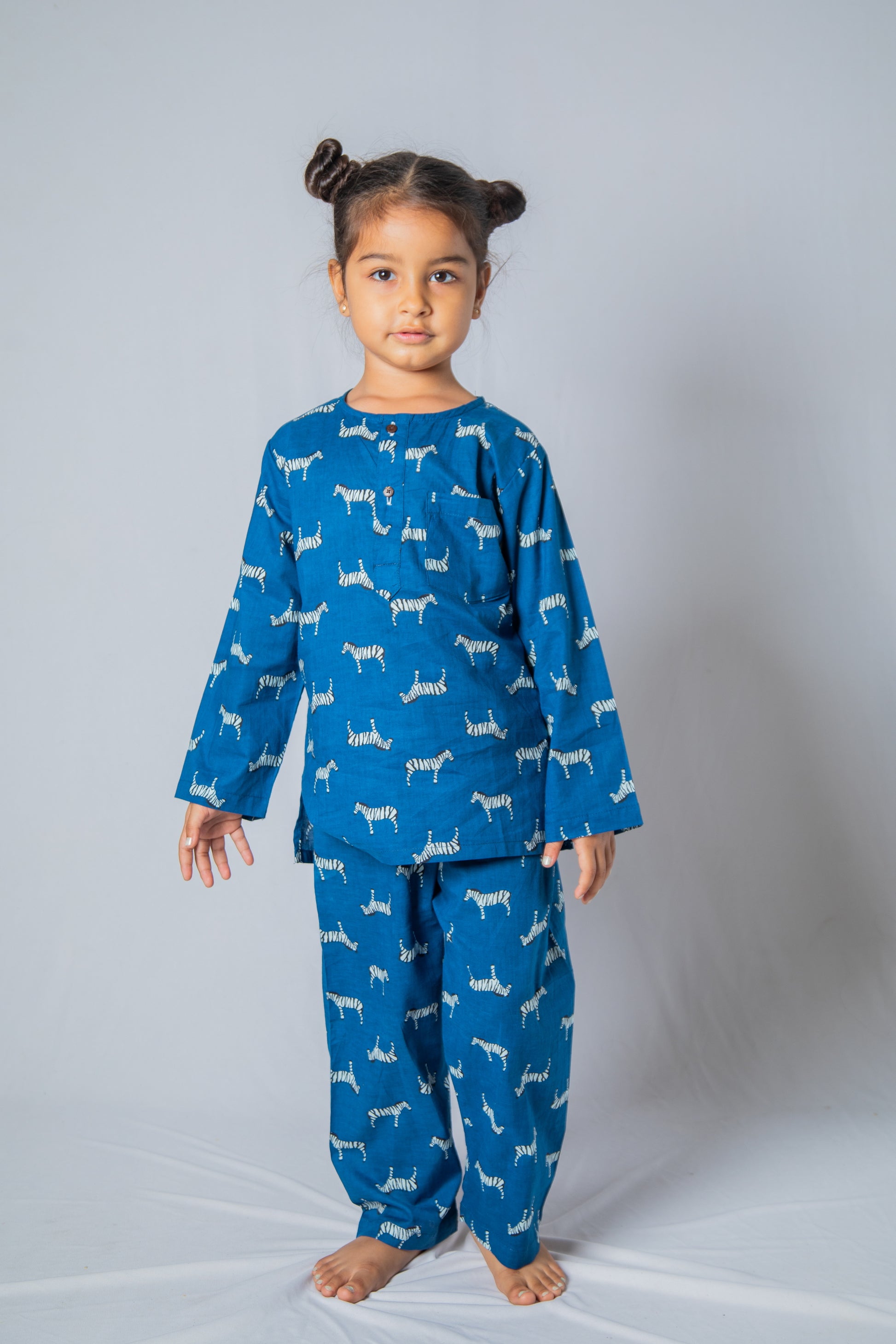 Sleep tight in our soft cotton mul night suit with zebra print top and bottom set which is screen printed.